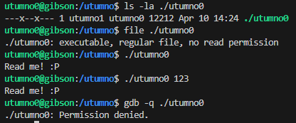 When looking at the file permissions of the Utumno binaries it’s important to note they are -r-sr-x--- (except utumno0) and the owner user has the s setuid bit set. This means the file will be run with the owner’s privileges. While for the group users they can only x execute the file without the setuid bit set.