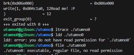Looking further, according to ltrace and strace there did not seem to be any library calls but there was a system call to write(). The binary could be dynamically linked but it was not possible to verify it with ldd since it’s read protected.