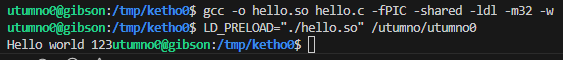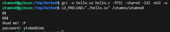 We could still try anyway to make our own library and override and hook the printf or puts function by setting the LD_PRELOAD environment variable when calling /utumno0.