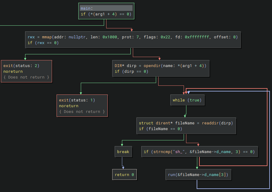 sh_. If so, then it calls therunfunction with the rest of the filename. - run: This copies the filename argument into executable memory and then executes it by returning its address.