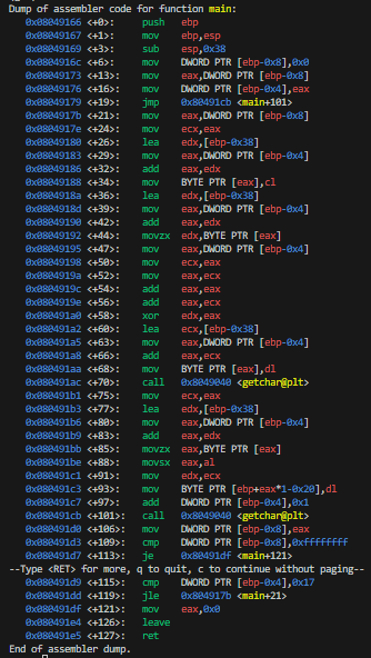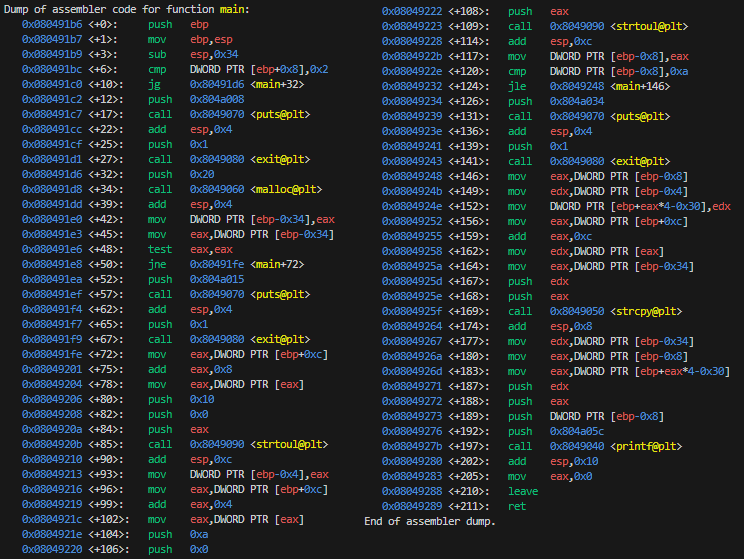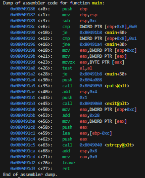 First we want to find the return address, which should be stored at $ebp+4 when setting the breakpoint at main.