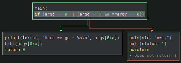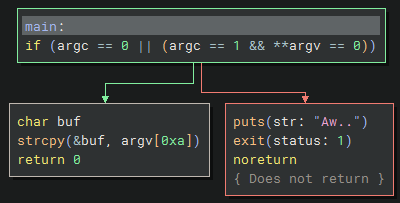 This binary seems to check if there are zero arguments to the main function, or if there is 1 argument and that argument is an empty string, then it will pass the check. Otherwise it prints “Aw..”.