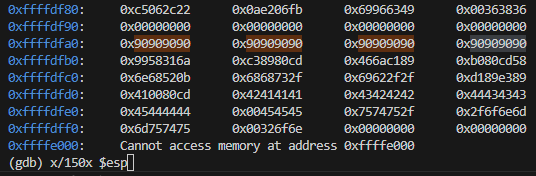 Run the code in gdb and once it segfaults we can inspect the stack with x/150x $esp. Here 0xffffdfa0 is in the nop sled.
