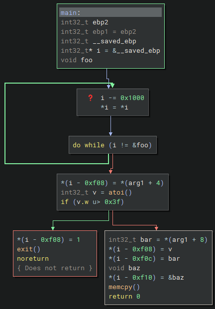 Although I’m not sure whether Binary Ninja properly decompiled the binary, looking at the weird ebp variables, the question mark and the empty atoi and memcpy calls.