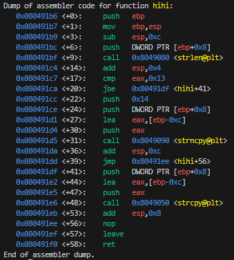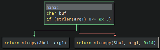 The hihi function checks if the argument is 19 bytes (0x13) or less, then it will use strcpy() to copy to the buffer. Otherwise it uses strncpy() to copy at most 20 bytes (0x14); which both seem to be vulnerable to buffer overflows.