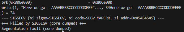 The code will segfault and when debugged with strace it shows we successfully overflowed the EIP register with EEEE.