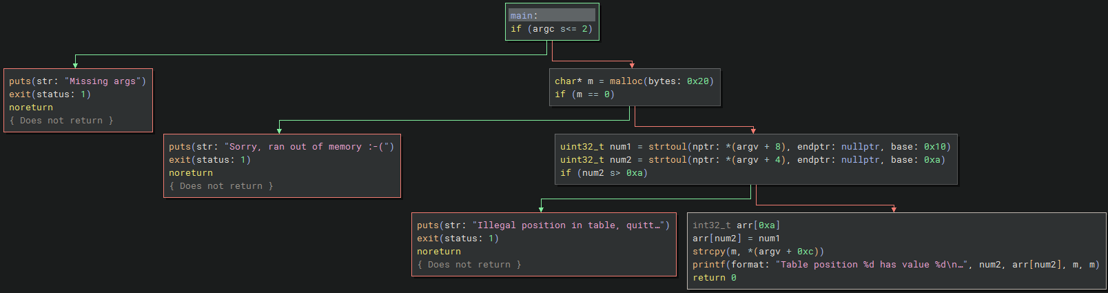 The binary requires at least 2 or more arguments, otherwise it exits early. It also reserves 32 bytes (0x20) of heap memory.