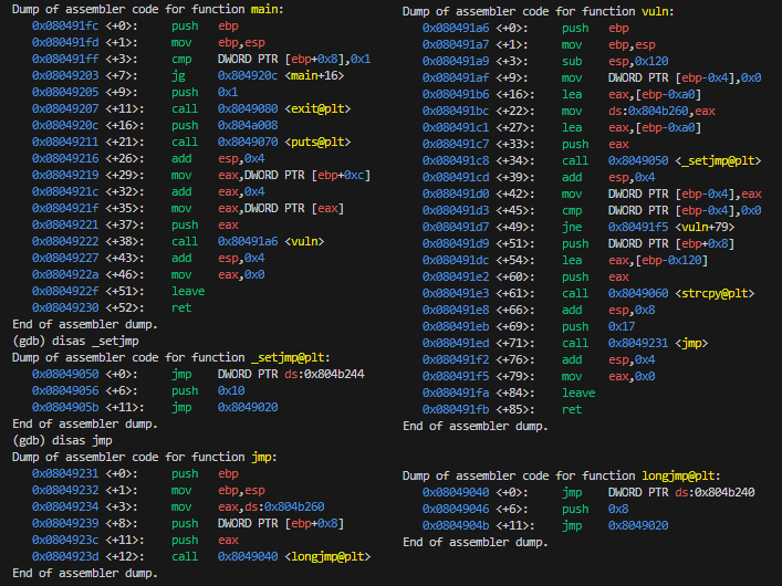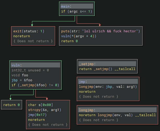 The vuln function sets up a stack buffer and copies the user input (arg1) into the buffer without checking the size; which should be vulnerable to a buffer overflow. I’m not sure about the various jmp functions which make it more difficult to follow the control flow.