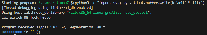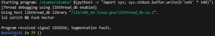 (gdb) run $(python3 -c "import sys; sys.stdout.buffer.write(b'\x41' * 140)")
